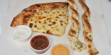 Our bread-sticks come with 5 bread-sticks and 2 dipping sauces.